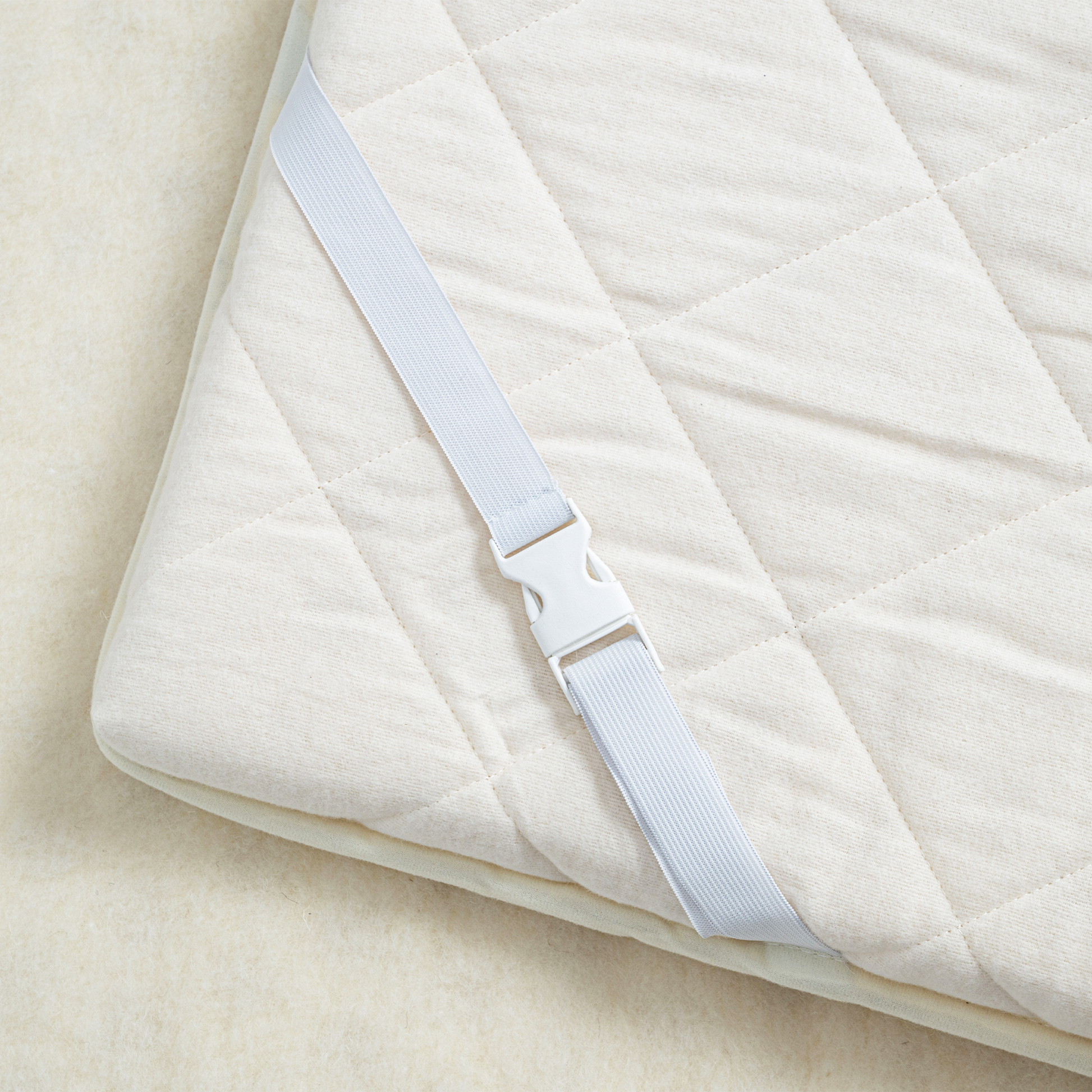 Övermadrass i naturlig färg med ett ytterlager i 100 % merinoull. Innerlager av latex som formar sig naturligt efter kroppen.