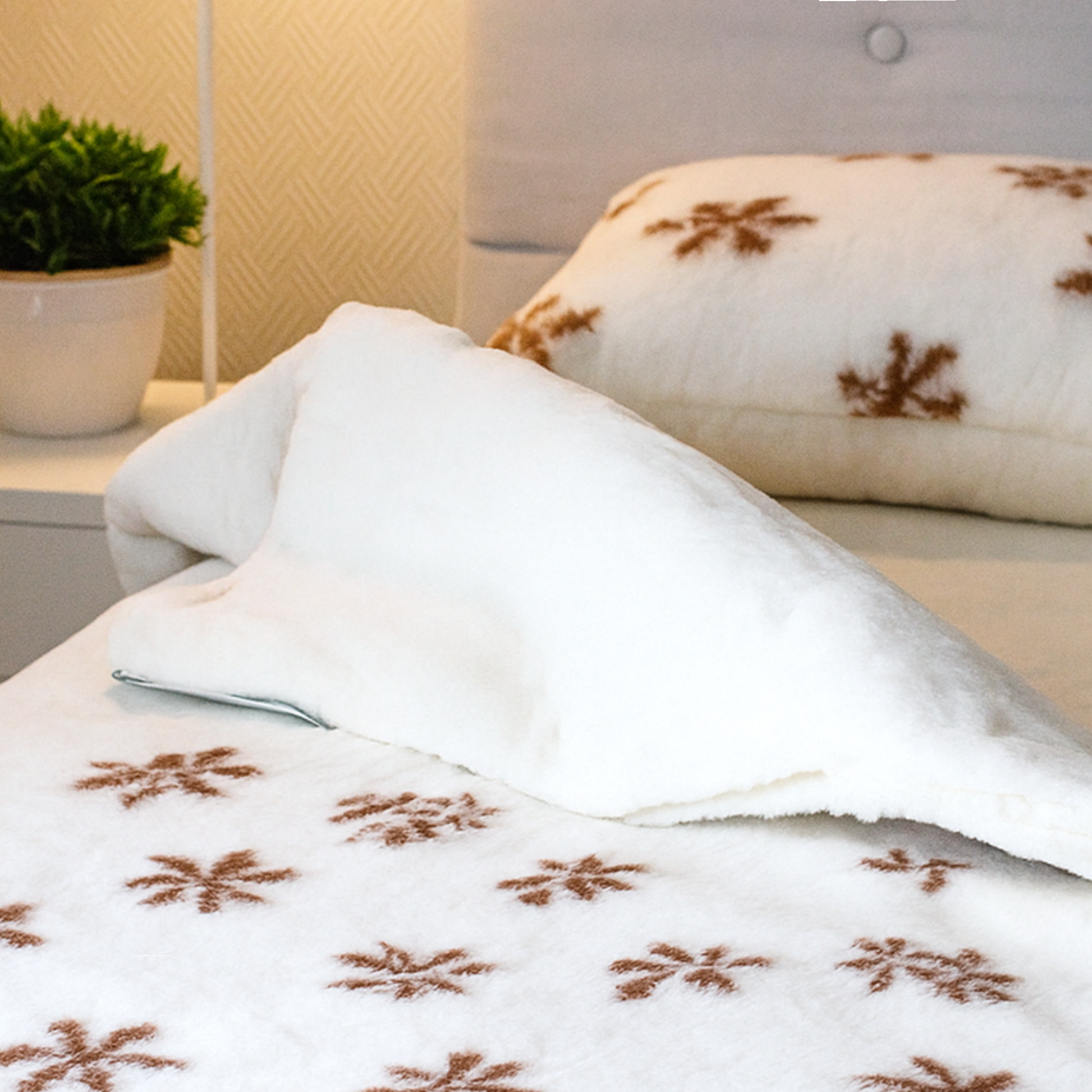 Täcke i utgående mönster av 100 % merino i storlek 140×200. Merinoull är mjukare än all annan ull från får och är något av det mjukaste man kan sova på. Fördelarna med att sova i merinoull är: